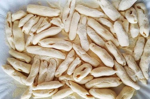 - Miscelare le due farine – aggiungere l’acqua calda e impastare mantenendo quella temperatura – ultimare l’impasto solo quando sarà ben compatto e avrà assorbito tutta l’acqua