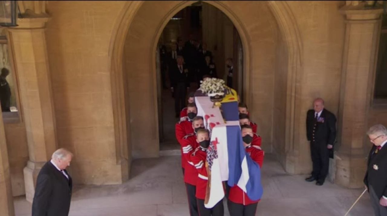 Il feretro di Filippo è stato trasportato su un Range Rover Defender adattato, e la bara avvolta nello stendardo personale del Principe, con la spada e il cappello di Ufficiale di Marina. L’onore di portare la bara del Duca all’interno della Cappella di San Giorgio è andato ai Royal Marines. I quali, assieme alla banda dei Granadier Gards, gli hanno reso gli omaggi militari, all’esterno della Cappella.