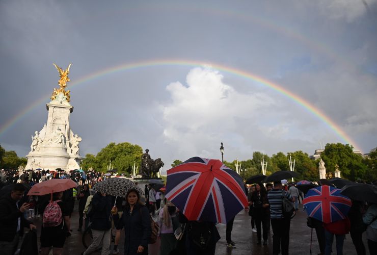Una pioggia fitta sembrava rappresentare lo stato d’animo degli inglesi, in pena per la loro Sovrana. All’annuncio della morte, diffuso intorno alle 18.30 inglesi, però, su Buckingham Palace è spuntato un doppio arcobaleno che giungeva fino al Castello di Windsor. Questo fenomeno atmosferico è già unico nel suo genere, ma in quell’occasione in molti vi hanno visto molto di più.