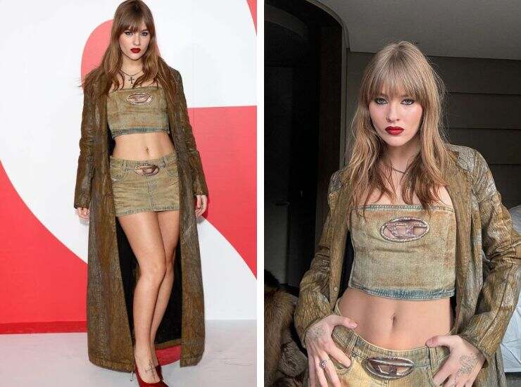 Prima ancora di supportare Armani, è apparsa alla sfilata Diesel proponendo un look denim ma in palette terrosa. Minigonna a vita bassa, top a fascia ton sur ton e long coat in demin effetto animalier per la bassista dei Maneskin, naturalmente firmato Diesel, a cui ha abbinato décolleté lucide bordeaux a punta. Per la sfilata di MM6 Maison Margiela, invece, ha preferito un completo total black, classico ed elegante, con profonda scollatura e giacca monopetto. In occasione della sfilata di Blumarine, invece, ha rafforzato il trend del total black ma con ricami in pizzo e corpetto di rouches che gioca con le trasparenze. A ravvivare il look anche un coprispalle di piume bianco perla. Non passano di certo inosservate le mules ravvivate frange morbide total black.