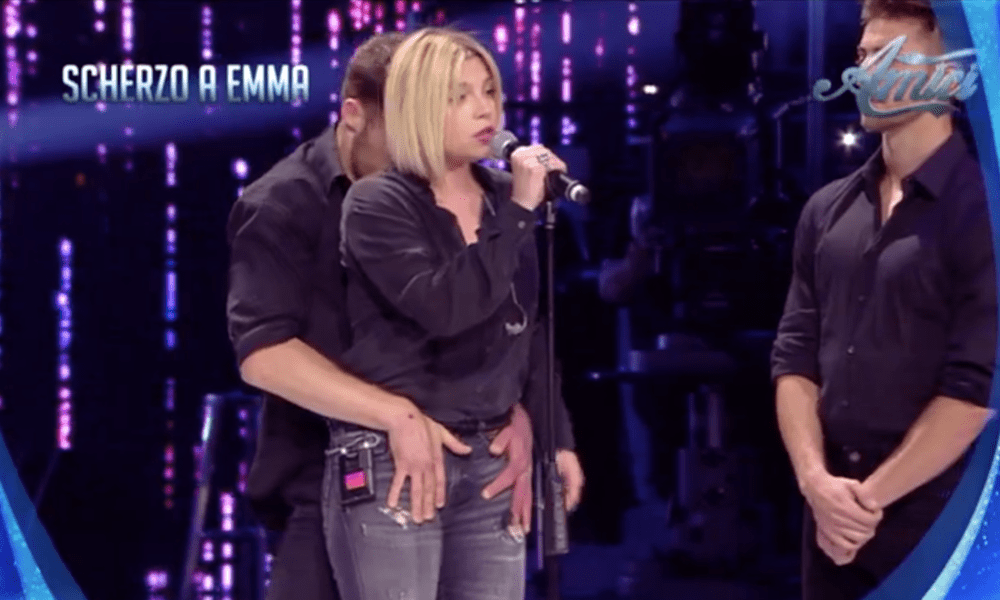 Pare proprio che Maria De Filippi ce la stia mettendo tutta per strappare ascolti a Ballando con le Stelle, oltre al ballo tra Emma e Stefano De Martino, arriva anche uno scherzo decisamente hot alla cantante. La produzione di Amici di Maria De Filippi ha organizzato un siparietto decisamente a luci rosse per Emma Marrone che si è ritrovata in una situazione imbarazzante… Durante le prove un ballerino – come si vede nel video – si è preso un po’ troppe libertà nei contronti della cantante. Emma ha iniziato a lamentarsi: “Me lo appoggia“. Poi però il ballerino non si è fermato e ha proseguito con palpatine sul corpo sino poi al peggio: “Mi ha toccato le tette“. Così Emma dopo un calcio liberatorio se la prende col coreografo. E alla fine tutti a dirle: “È uno scherzo”. La storia finisce bene nessuna brutta reazione di Emma che abbraccia anche il ballerino ‘molestatore’.