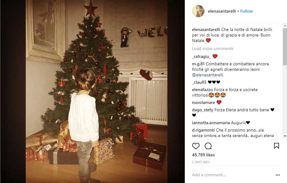 Gli ultimi aggiornamenti però riguardano il Natale passato in famiglia; la conduttrice tv ha voluto postare appunto una foto su Instragram. In occasione della Vigilia ha postato una foto della sua secondogenita Greta, di spalle, di fronte al grande albero addobbato e ha aggiunto: “Che la notte di Natale brilli per voi di luce, di grazia e di amore. Buon Natale”. Tra i commenti spicca quello dell’amica Melissa Satta, vicina alla famiglia in un momento così delicato.