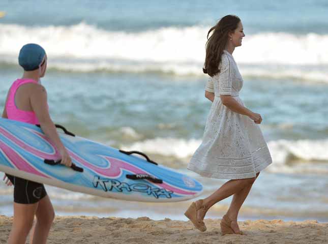 The Duchess of Cambridge runs across the beach as the Duke and Duchess view a surf life-saving display and meet volunteers at Manly Beach, Sydney, during the twelfth day of the Duke and Duchess of Cambridge's official tour to New Zealand and Australia.