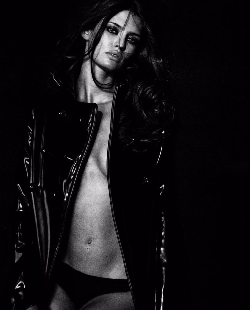 Nella fotografia, infatti, la Balti indossa solo una giacca nera di vinile – tenuta aperta – e un paio di slip dello stesso colore. A incantare non è solo il suo corpo perfetto, ma i suoi occhi che, truccati di nero, risaltano ancora di più. Impossibile non restare abbagliati dalla sua bellezza.