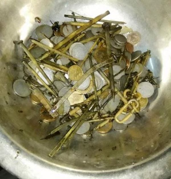 Una storia che supera i limiti del paradossale quella occorsa a Maksud Khan, un autista indiano di 35 anni residente nel distretto di Satna, nel Madhya Pradesh. Da diversi mesi era afflitto da fortissimi dolori addominali e proprio per questo motivo si era recato presso l’ospedale Sanjay Gandhi di Rewa. I dottori hanno cercato prima di tutto di escludere l’ipotesi di un’intossicazione alimentare e sono poi ricorsi a un’endoscopia il cui referto li ha lasciati a bocca aperta: nel corpo del paziente c’erano 7 chili di materiale estraneo tra cui 263 monete, 100 chiodi, qualche lametta da barba, frammenti di vetro, vari tipi di pietre, pezzi di ferro arrugginiti.