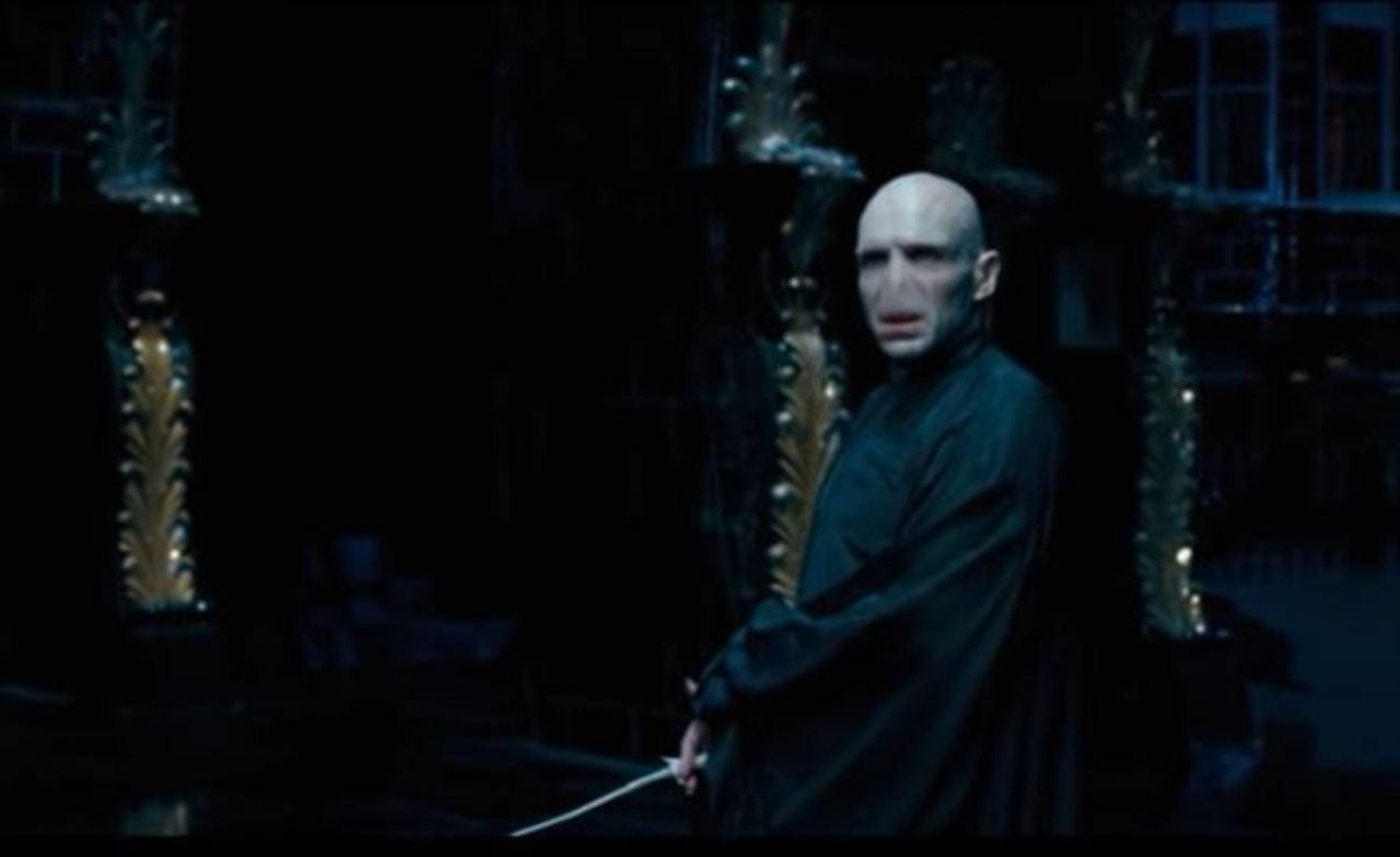C’è sempre un cattivo. C’è sempre un cattivo che desidera il potere assoluto; il suo intento è distruggere la serenità e la libertà di una comunità. Vuole vedere attorno a sé riverenze e disperazione. Agogna essere il numero uno. E’ sempre così, e nel caso di Voldemort -colui che non dovrebbe essere nominato- in Harry Potter tutto è amplificato. La magia oscura è il fulcro del suo mondo, del suo essere, senza di essa non avrebbe potuto conquistare, anche se per un tempo brevissimo, Hogwarts e il mondo della magia. C’è sempre Londra sullo sfondo, c’è sempre Harry con la cicatrice, ma quando si parla di Tom Riddle le atmosfere diventano terribilmente ostili, crude e spente. Dal primo all’ultimo libro, dal primo all’ultimo film, Harry e Tom danzano; sono agili, si sfidano a distanza, a volte sono troppo vicini. Il signore oscuro si materializza ai nostri occhi e a quelli di Potter mente Cedric Diggory se ne va. Harry è Parte di lui, ma lui non è, almeno nelle intenzioni, parte di Harry. Per le pellicole cinematografiche Ralph Fiennes ha modificato completamente il proprio aspetto; nella realtà è un bell’uomo e oggi ha 57 anni…