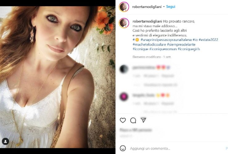 Sono trascorsi molti anni da allora e Roberta ha mantenuto fascino e bellezza. Oggi sul suo account social la Modigliani risulta esser come allora bellissima. Una donna che mostra il tempo che passa con eleganza e con una nuance nuova sui suoi capelli, che dal moro al biondo e qualche ritorno al colore naturale, Modigliani si scatta un selfie con una lunga chioma color rame.