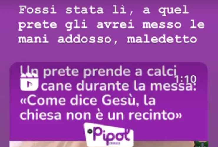 Non è la prima volta che la cantante romani si schiera dalla parte dei più deboli e questa volta lo fa difendendo gli animali. Non è potuta rimanere indifferente ad una clip che racconta di un prete che prende a calci un cane durante la messa. La lingua che appare sul video è spagnola ma c’è un virgolettato che riporta presumibilmente a quello che ha detto il sacerdote. “Come dice Gesù la chiesa non è un recinto“, immediata è stata la risposta della Turci che arrabbiata condivide la clip aggiungendo: “Se fossi stata lì, a quel prete, gli avrei messo le mani addosso. Maledetto“. Le parole chiare e dirette della cantante hanno fatto intendere tutta la sua indignazione per il gesto crudele del prete. La Instagram Stories ha raccolto tutti i followers alla riflessione.