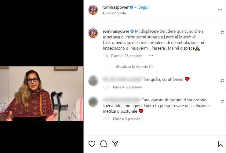 Le notizie sulla salute di Romina sembrano, però, continuare a non migliorare. In quanto, come già anticipato, poche ore fa ha comunicato la sua assenza ad un evento organizzato presso il Museo Castromediano di Lecce a cui avrebbe dovuto prendere parte insieme al figlio Yari. La cantante, infatti, ha dovuto dare forfait a causa di alcuni problemi fisici. L’annuncio è arrivato attraverso il suo profilo ufficiale di Instagram nel quale ha postato un video nel quale dice: “sfortunatamente il mio corpo in questo periodo mi sta dando del filo da torcere. Non mi permette di essere agile come vorrei. Non riesco proprio a camminare, altrimenti sarei con voi questa sera”. A seguito di queste parole i fan sono apparsi parecchio preoccupati. Moltissimi, infatti, sono stati i messaggi d’affetto e vicinanza rivolti all’artista.