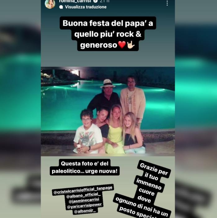 “Grazie per il tuo immenso cuore dove ognuno di noi ha un posto speciale”. Queste le parole che Rominia Jr allega ad un dolcissimo scatto condiviso su Instagram, in occasione della festa del papà. Per fare gli auguri ad Al Bano, il papà “più rock e generoso”, Romina ha scelto di pubblicare una foto in cui il cantante si trova in compagnia dei suoi figli al completo. Uno scatto dolcissimo, che risale a un bel po’ di tempo fa: