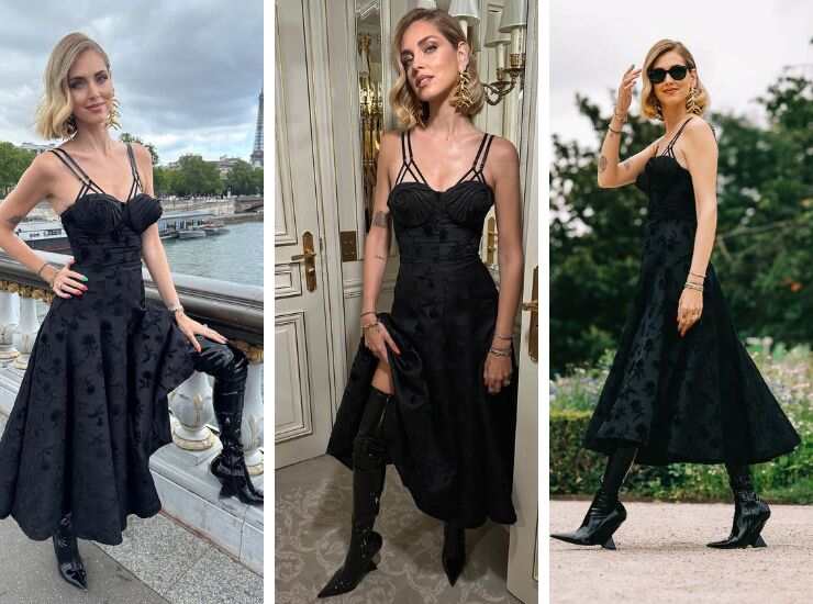 E proprio perché estremamente legata a queste due realtà che Chiara Ferragni ha cercato di fare spazio alla Paris Fashion Week nella sua fitta agenda estiva. Di ritorno a Parigi, ha infiammato il front-row con i suoi look dedicati alle maison. Tutto ha avuto inizio con un look firmato Schiaparelli, in perfetto stile della maison seppur piuttosto sobrio rispetto alle precedenti settimane della moda. Chiara Ferragni ha scelto un abito nero con delicato ricami in pizzo, ma la vera chicca è il corpetto con le coppe a forma di cono che ricordano due boccioli. L’abito in questione realizzato da Daniel Roseberry è accompagnato da un taglio ad altezza coscia. L’influencer vi ha abbinato cuissardes lucidi, naturalmente firmati Schiaparelli, e orecchini pendenti placcati in oro a forma di code di pesce.